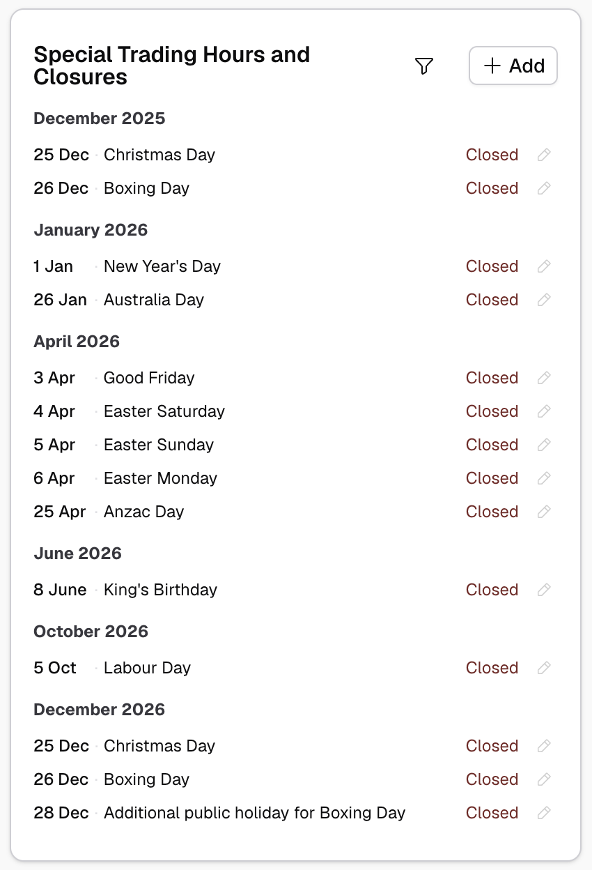 Exceptions are date-specific overrides to normal operating hours. You can use these to specify different trading hours for public holidays or other special occasions.