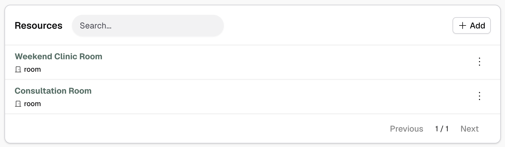 Resources are the things that can be booked - typically consultation rooms or pharmacists. Resources can also represent equipment or other facilities if needed.